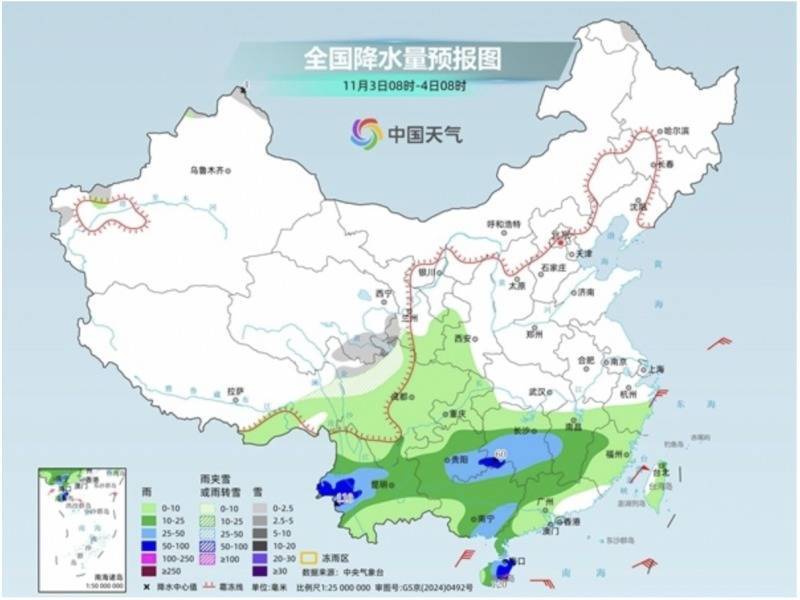 r具体来看,中央气象台预计,今天,黑龙江东南部、吉林东部、西藏北部和东部、青海南部和西部、川西高原等地部分地区有小到中雪或雨夹雪,其中,西藏东北部等地局地有大到暴雪。西藏东南部、四川南部、云南大部、贵州、湖南西部、海南岛等地部分地区有中到大雨,其中,云南中西部、海南岛东南部等地局地有暴雨或大暴雨。